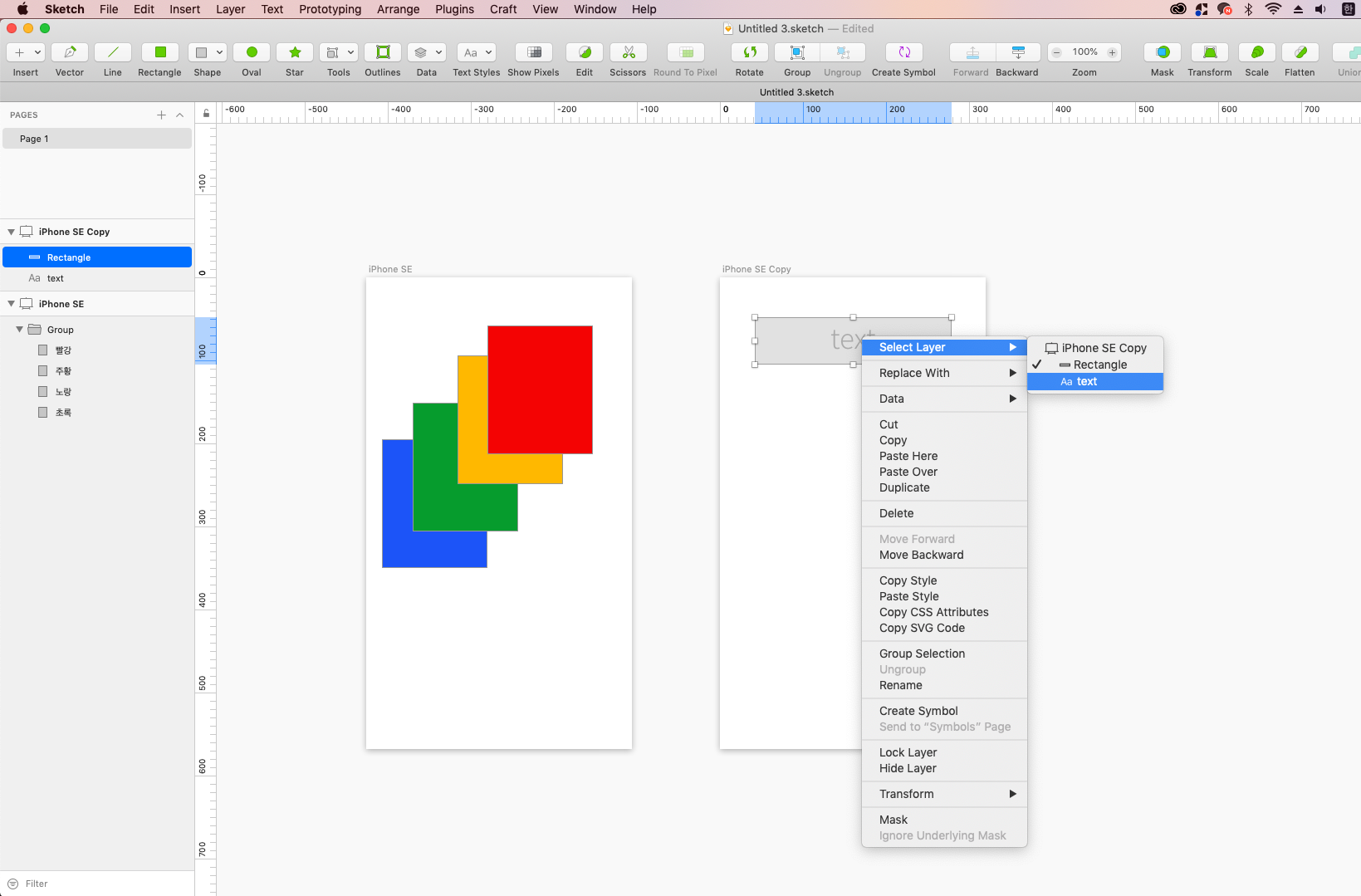 선택하고자 하는 컴포넌트에 마우스 커서를 위치시키고 마우스 오른쪽 클릭하면 select layer메뉴에서 겹쳐진 순서대로 레이어명이 보여집니다.선택하고자 하는 컴포넌트(노랑)를 선택하면 됩니다.