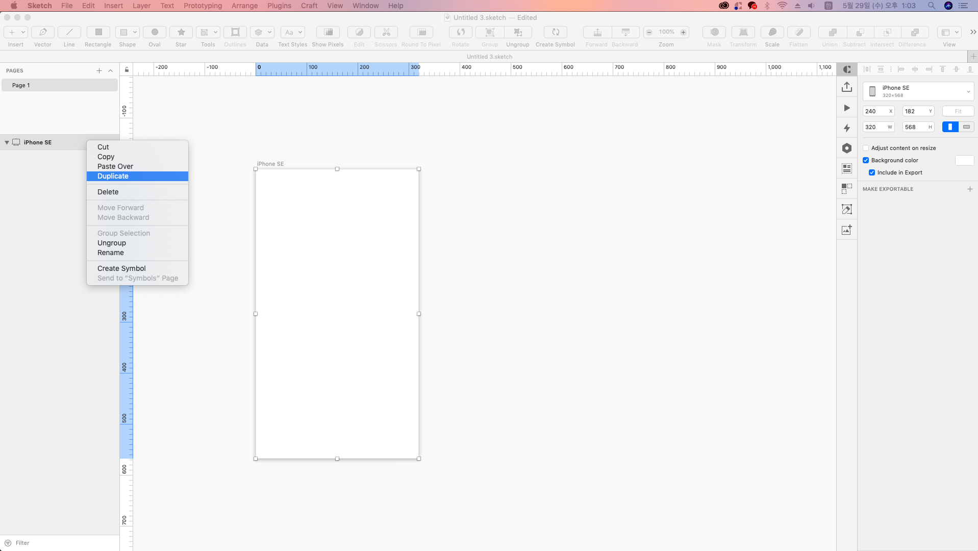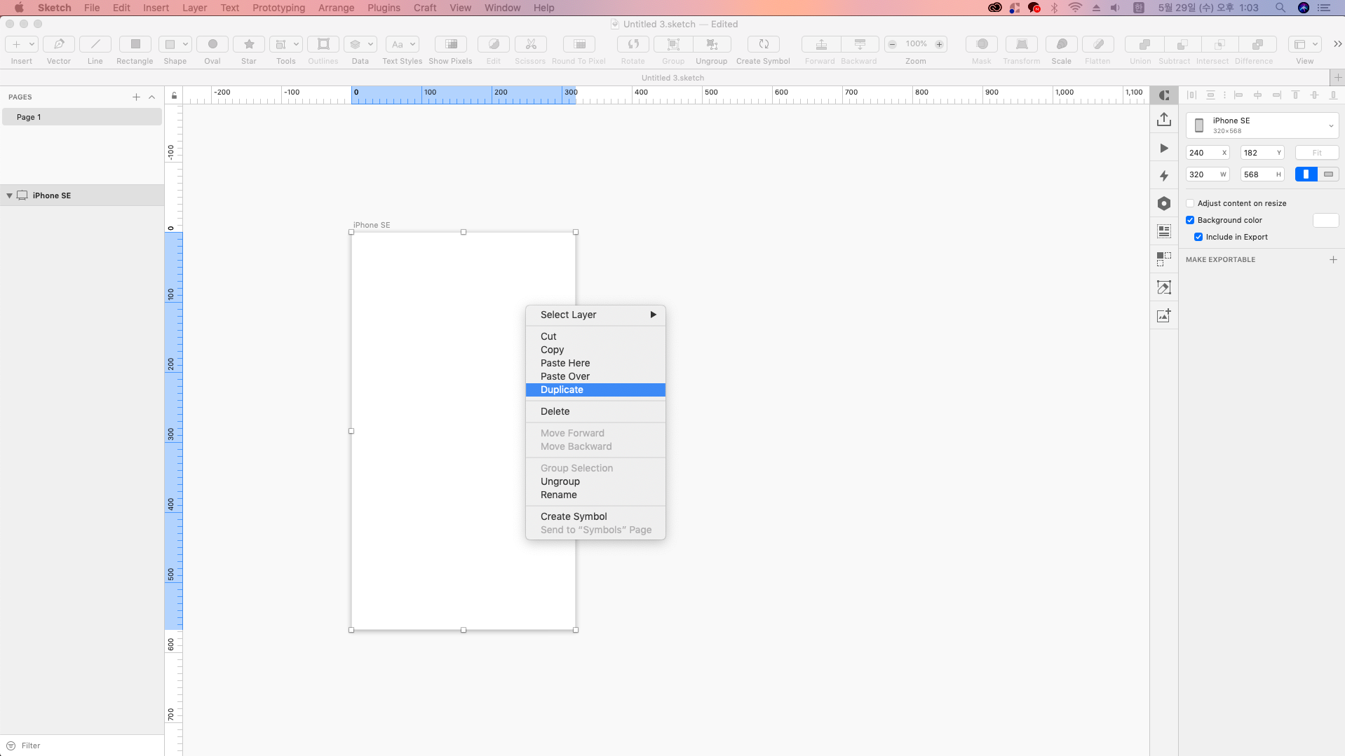 다른 방법으로 오른쪽 레이어 리스트에서 아트보드를 선택하고 마우스 오른쪽키를 눌러 duplicate를 선택해서 같은 크기의 아트보드를 복제할 수 있습니다.
