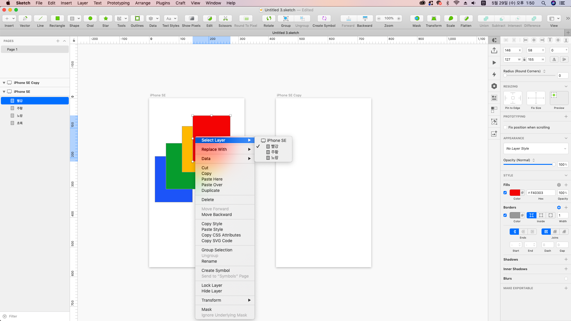 command를 누른상태에서 노란 사각박스를 선택하면 위의 그림처럼 파란색으로 활성화 되고 오른쪽 레이어리스트에서는 어떤 레이어인지 회색외각라인 박스로 보여집니다.